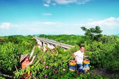 湖南省芷江侗族自治縣的果農(nóng)在鐵路橋附近摘桃子。高鐵的建設(shè)開通對(duì)沿線群眾發(fā)展產(chǎn)業(yè)有著積極作用。李小平攝