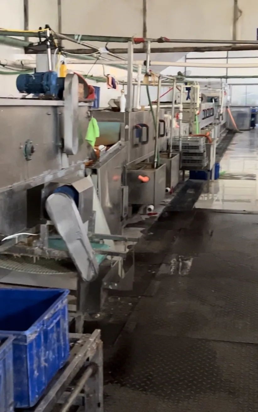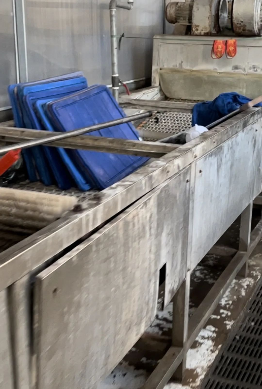 進(jìn)入廠房首先看到的就是一整車餐余垃圾,靠墻放置著多箱已使用后的餐具,地面上存有積水,機(jī)器處于停止?fàn)顟B(tài),工作臺上留有殘余垃圾,還有鞋墊在上面晾曬。在此期間有多輛小型貨車來裝卸餐具。
