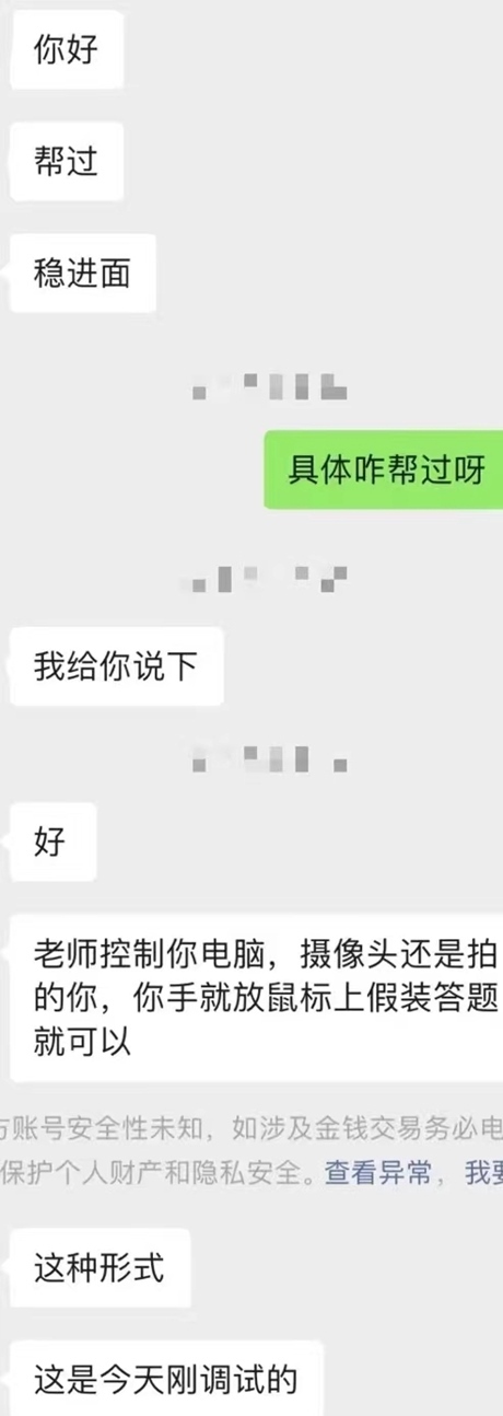 “老師(遠(yuǎn)程)控制你的電腦,你手放在鼠標(biāo)上假裝答題就可以。”