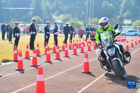 12月1日,在長沙市望城區(qū)新河學(xué)校,長沙市公安局望城分局交警大隊(duì)的鐵騎隊(duì)員進(jìn)行技能展示。