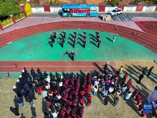 12月1日,在長沙市望城區(qū)新河學(xué)校,學(xué)生觀看交警手勢演示(無人機(jī)照片)。