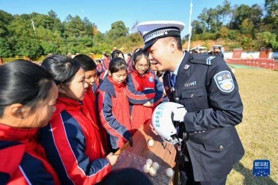 當(dāng)日,長沙市公安局望城分局交警大隊(duì)的民警走進(jìn)農(nóng)村地區(qū)學(xué)校,通過交警手勢演示、鐵騎技能展示、交通標(biāo)識競答、頭盔碰撞模擬體驗(yàn)、汽車盲區(qū)體驗(yàn)等多種形式,開展道路交通安全宣傳活動,幫助學(xué)生們提高交通安全意識。