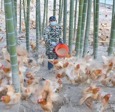 安吉縣利用良好生態(tài)優(yōu)勢(shì)發(fā)展林下養(yǎng)殖。圖為農(nóng)戶(hù)正給竹林雞喂食。夏鵬飛攝