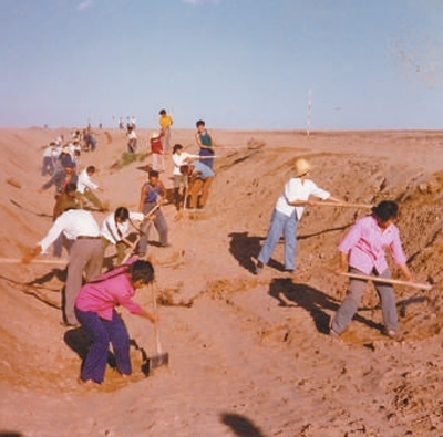 上世紀(jì)80年代,磴口縣干部群眾在挖掘灌溉渠。中國林科院沙漠林業(yè)實驗中心供圖