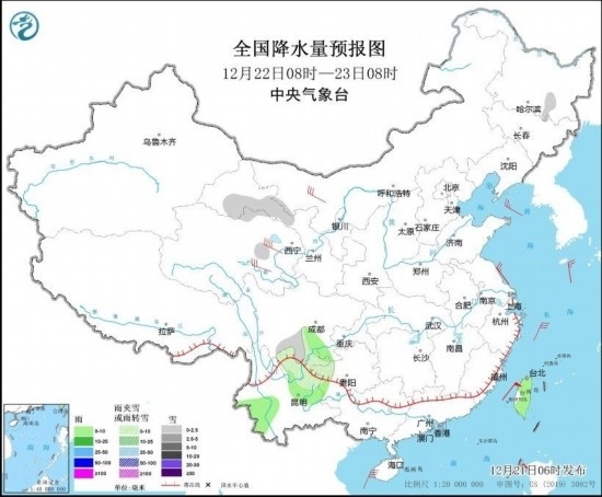 圖4 全國(guó)降水量預(yù)報(bào)圖(12月22日08時(shí)-23日08時(shí))