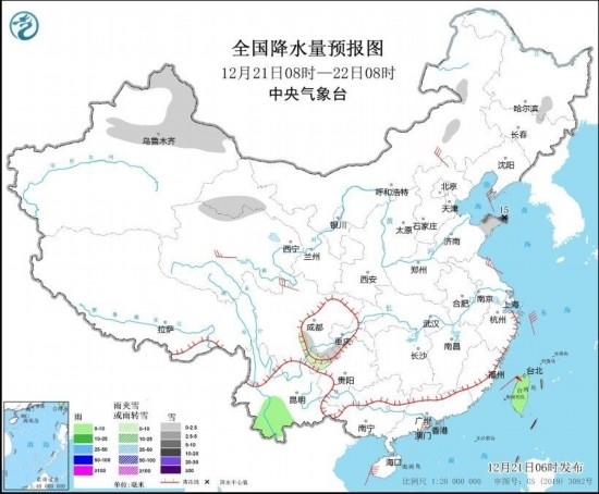 12月21日08時(shí)至22日08時(shí),新疆北部、甘肅河西、黃淮東部等地部分地區(qū)有小雪或雨夾雪,其中,山東半島等地部分地區(qū)有中到大雪,局地暴雪(10~15毫米)。云南西南部和中部、臺(tái)灣島等地部分地區(qū)有小雨。內(nèi)蒙古東南部、青海北部、江蘇中部、川西高原北部等地部分地區(qū)有4~6級(jí)風(fēng)(見(jiàn)圖3)。
