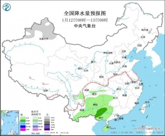 1月12日08時至13日08時,新疆北疆北部、川西高原南部等地部分地區(qū)有小雪或雨夾雪。四川盆地南部、湖南西部、貴州、云南東部和南部、廣西、海南島等地部分地區(qū)有小到中雨。西藏中部部分地區(qū)有5~6級風;南海東部和西南部等海域有6~7級風、陣風8級。