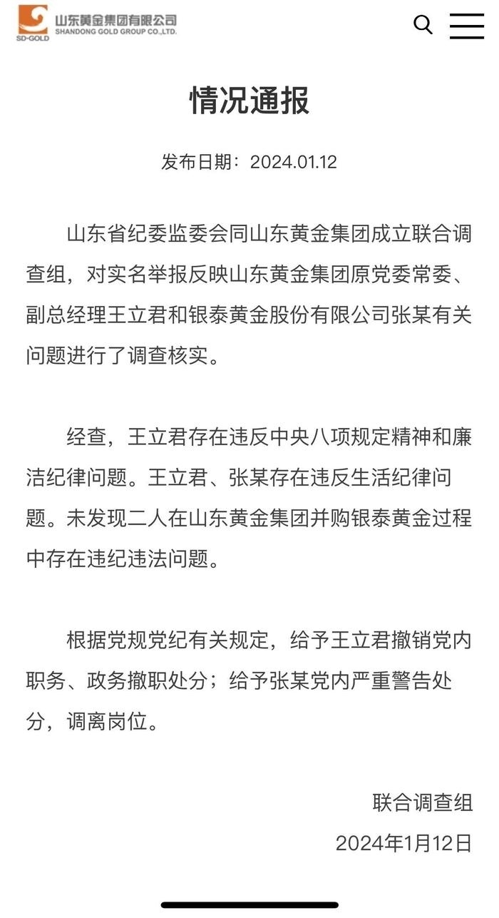 ·山東黃金集團(tuán)通報(bào)男子舉報(bào)妻子出軌國(guó)企領(lǐng)導(dǎo):給予王立君撤銷黨內(nèi)職務(wù)、政務(wù)撤職處分。