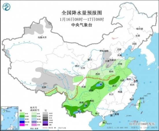 1月16日08時至17日08時,新疆北部、西藏中東部、青海南部、陜西中北部、華北南部和西部、黃淮西部和北部、川西高原、云南西北部等地部分地區(qū)有小到中雪或雨夾雪。黃淮南部、江淮大部、江漢、湖南西部和北部、西南地區(qū)大部、廣西西部等地部分地區(qū)有小到中雨,其中,湖北西南部、重慶東北部、云南南部等地局地有大雨(25~45毫米)。內(nèi)蒙古中部、遼東半島等地部分地區(qū)有4~5級風(fēng)。南海中北部海域?qū)⒂?~7級風(fēng)、陣風(fēng)8~9級。