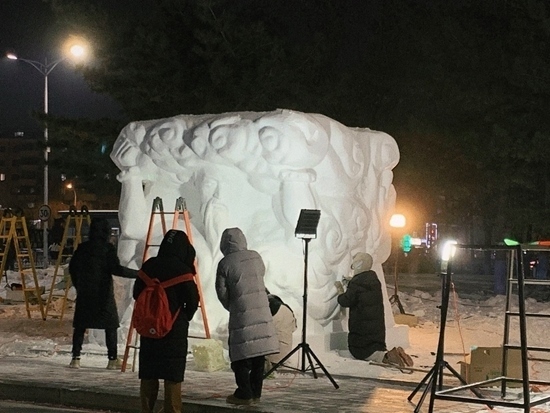 熊峻苓和同學(xué)在制作雪雕作品《盤(pán)古開(kāi)天》。熊峻苓供圖