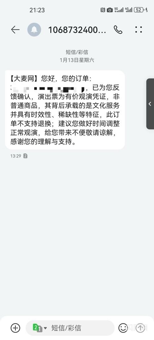 周女士說自己第一時間就通過多個渠道嘗試退票,但都沒有成功?!叭斯た头墓ぷ鲿r間是早上9點到晚上8點,我打電話的時候不在他們工作時間范圍內(nèi)。當時也確實聯(lián)系不到其他渠道,于是我就在12315,包括黑貓投訴進行退票退款的申請。13號早上9點,大麥客服說此訂單不支持退換,13號下午1點半的時候,給了我一個反饋短信,說是已為我反饋確認,演出票為有價觀影憑證非普通商品,其背后承載的是文化服務,并具有時效性、稀缺性等特征,此訂單不支持退換,然后就建議我做好時間調整正常觀演。”