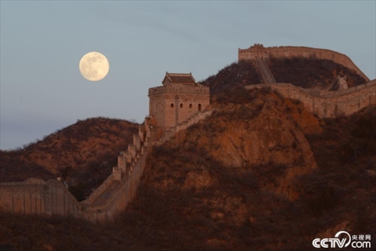 2024年1月25日,農(nóng)歷臘月十五,河北承德,傍晚時分,圓月映襯下的金山嶺長城,唯美壯觀。