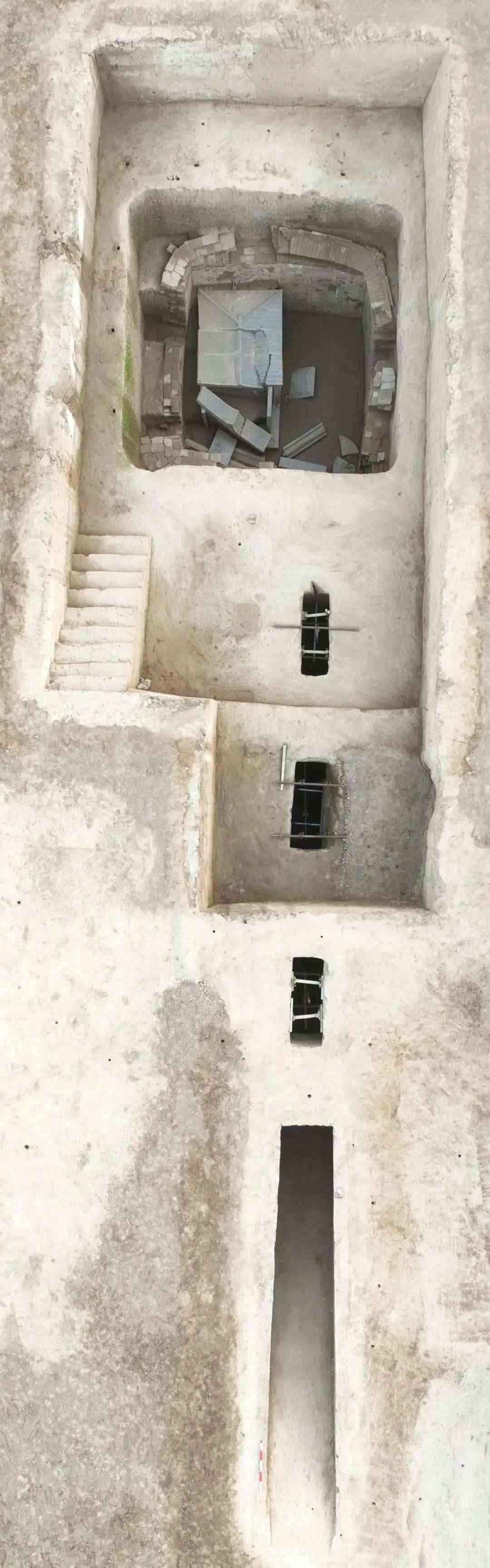 該墓為斜坡墓道三天井單室磚室墓,遭嚴(yán)重盜擾,石門(mén),墓室頂部等均被破壞,墓室內(nèi)各類(lèi)器物已被盜掘一空,僅發(fā)現(xiàn)有少量陶器殘片。墓道兩側(cè)各分布有兩個(gè)壁龕,壁龕內(nèi)殘存陶雞、陶狗、陶駱駝等動(dòng)物俑七十余件。