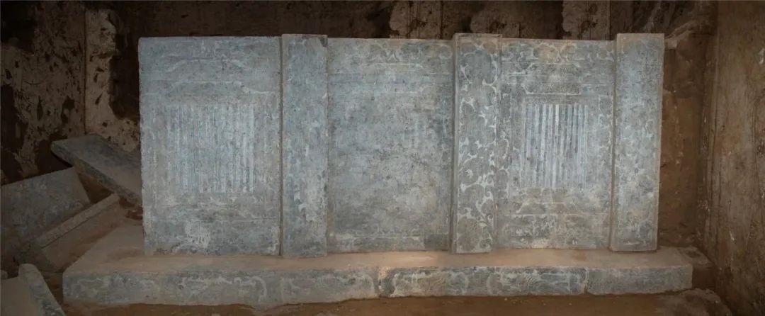 墓室西側(cè)發(fā)現(xiàn)石槨一具,保存較好。石槨面闊三間,進(jìn)深兩間,頂部為廡殿式,僅一側(cè)雕刻有瓦棱;槨身由壁板和倚柱卯和而成,板壁外側(cè)雕刻門(mén)窗、卷云及神獸,內(nèi)側(cè)主體為侍女,周邊飾有花草等內(nèi)容;倚柱內(nèi)外均刻纏枝卷草花朵,部分穿插飛禽走獸;基座以七塊石板鋪成,立面間隔刻有壸門(mén)圖案,內(nèi)填奔獸圖樣。石槨線刻精細(xì),畫(huà)面華麗而不繁縟,人物體態(tài)豐腴而不臃腫,充分體現(xiàn)出盛唐開(kāi)元時(shí)期圖案靈動(dòng)、富于想象的特征。