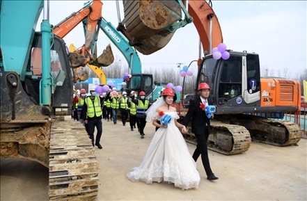 2021年2月8日,中建五局安徽公司合肥聚變堆項目技術(shù)人員蔣吉豐和愛人張小菊在項目工地舉辦了一場簡樸、溫馨的婚禮。