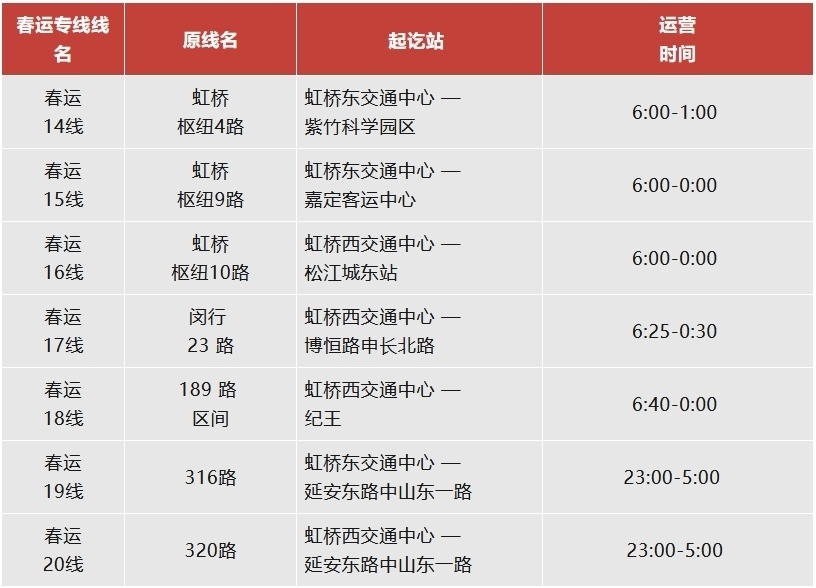 注:虹橋樞紐春運(yùn)專線運(yùn)營日期為2月14日至3月5日。