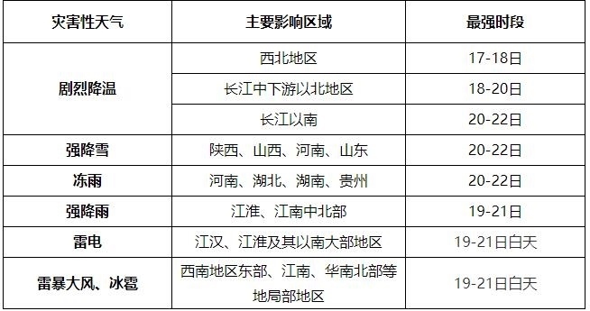 降雪和凍雨預(yù)報(bào):18日至22日,西北地區(qū)東部、華北、東北地區(qū)、黃淮、江淮、江漢、江南北部和西部等地將先后出現(xiàn)降雪或雨轉(zhuǎn)雪,其中陜西、山西、河北南部、河南、湖北、山東、蘇皖中北部、西藏西南部、青海東南部等地的部分地區(qū)有大到暴雪,局地大暴雪(累計(jì)降雪量8~15毫米,局地20毫米以上;新增積雪深度5~12厘米,局地15厘米以上); 20日至22日,河南、湖北、湖南、貴州將自北向南出現(xiàn)凍雨。