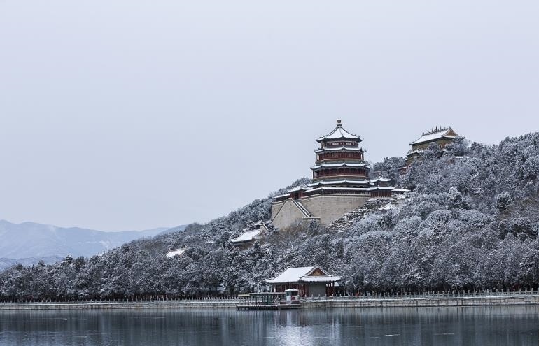2024年2月21日,北京,龍年初雪后的頤和園佛香閣古樸靜穆。