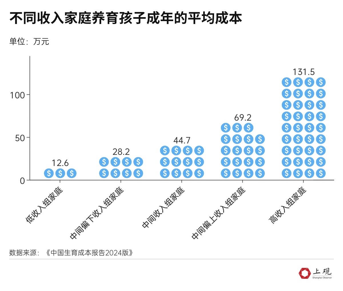 一線城市的成本則會(huì)更高。其中,在北京、上海養(yǎng)育一個(gè)孩子成年,平均成本分別達(dá)到93.6萬元、101萬元。以上海為例,養(yǎng)育孩子的開銷約占家庭收入的20%。