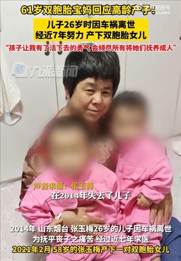 ·61歲雙胞胎寶媽回應高齡產(chǎn)子:兒子26歲時因車禍去世,兩個孩子給了我活下去的勇氣,會傾盡所有將兩個孩子撫養(yǎng)成人。