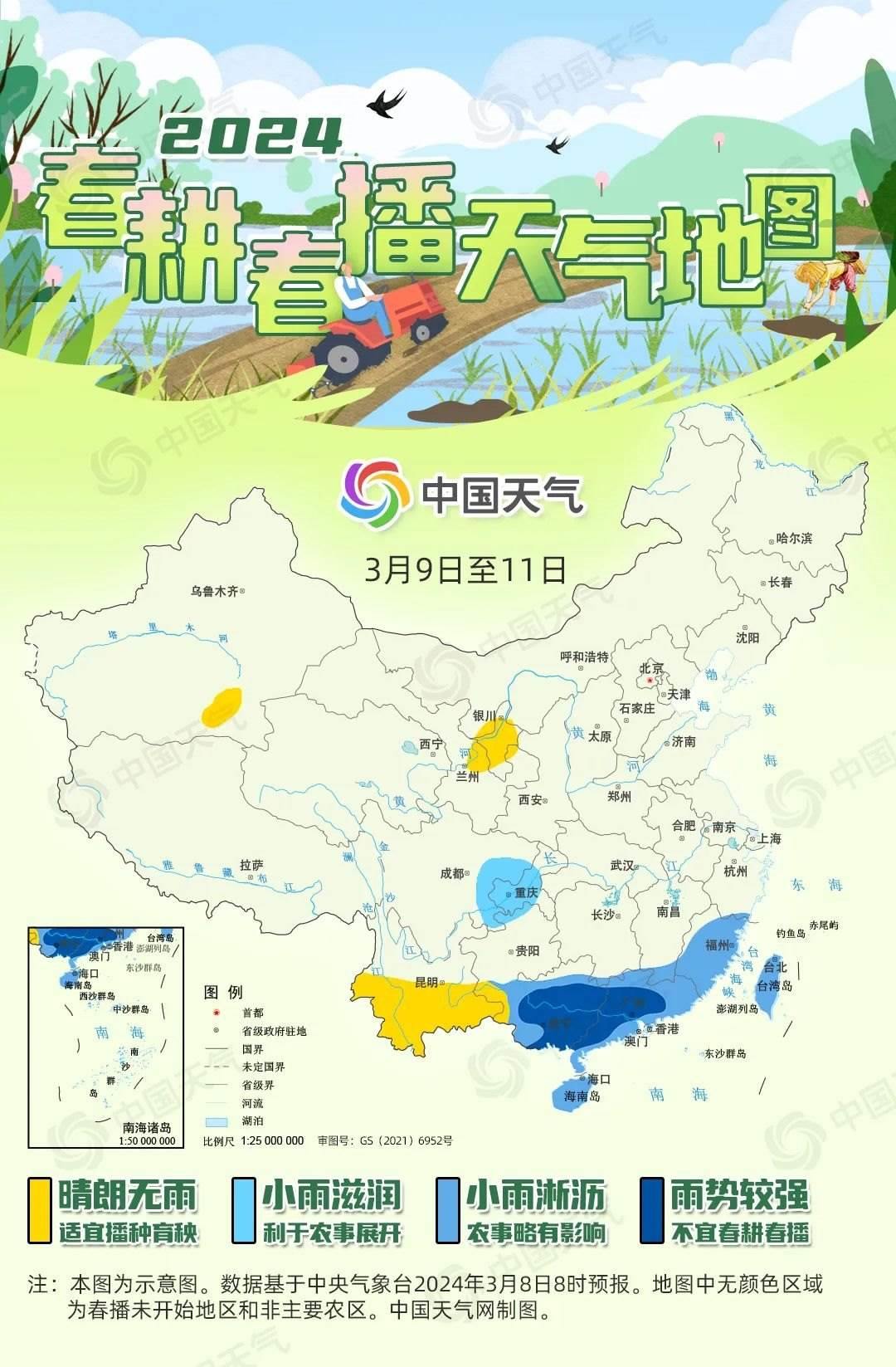 “微雨眾卉新,一雷驚蟄始。田家?guī)兹臻e,耕種從此起?!钡搅梭@蟄時(shí)節(jié),我國春耕春播工作已陸續(xù)展開,從華南到西北,田間地頭逐漸忙碌了起來。一年之計(jì)在于春,春耕春播工作對(duì)于全年糧食豐收至關(guān)重要。中國天氣網(wǎng)推出2024全國春播進(jìn)程圖和春耕春播天氣地圖,看各地春播何時(shí)展開,近期春播天氣如何。