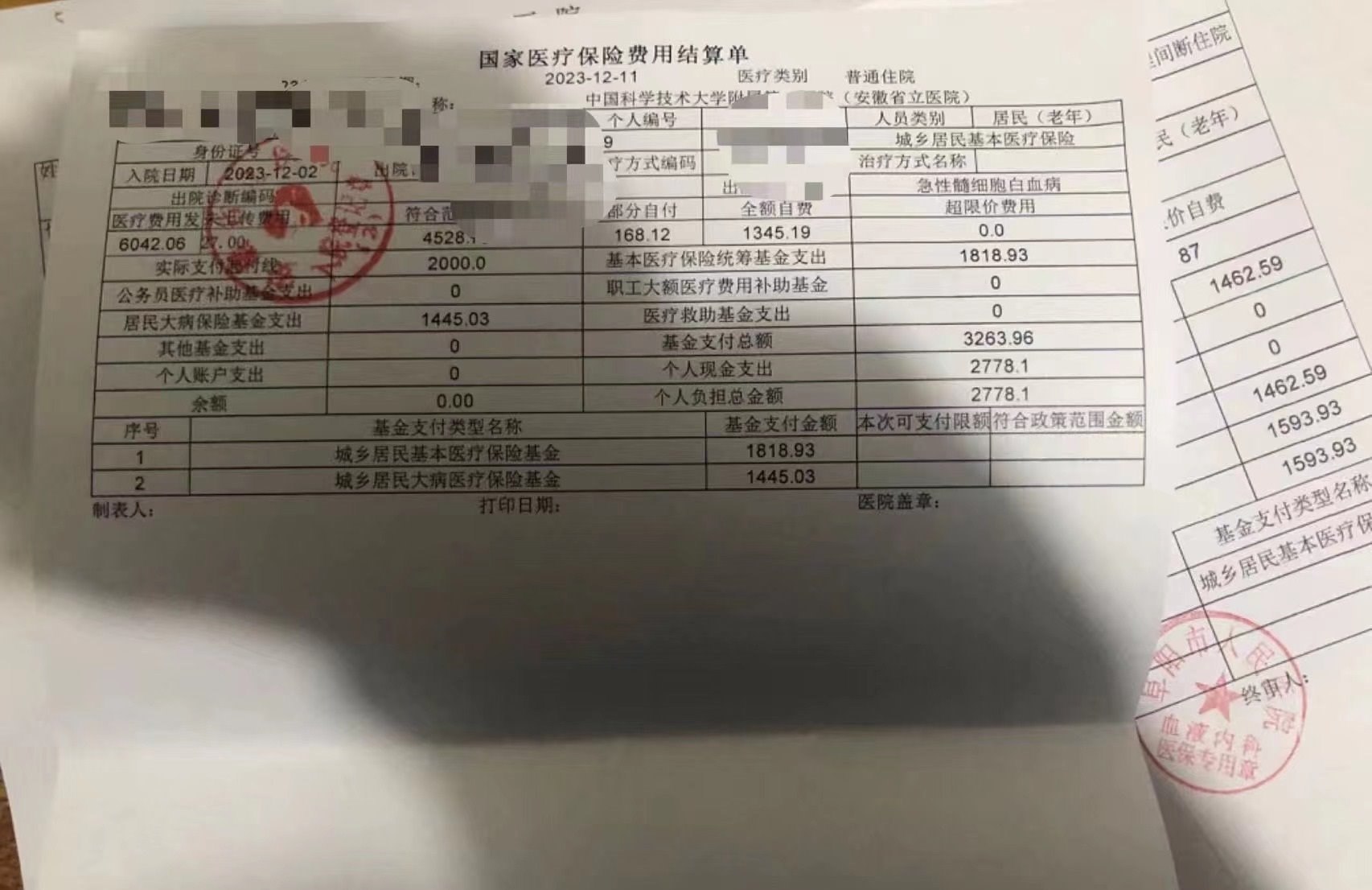 2023年秋季,她老公患上急性髓細(xì)胞白血病,后在合肥市某醫(yī)院治療,住院費(fèi)共花費(fèi)近10萬元,而自己僅交了2萬多元。
