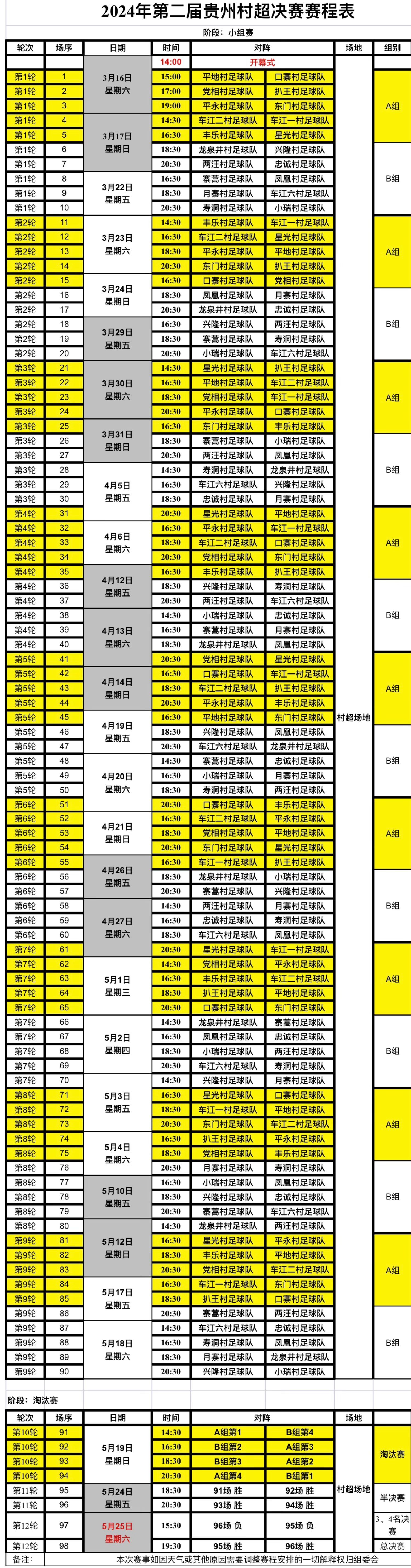 決賽階段的“村超”從3月16日開(kāi)始,每周五到周日都會(huì)保證有比賽,逢節(jié)假日還會(huì)舉行加賽。球迷們只要在出發(fā)前記得確認(rèn)一下賽程表即可。建議可以上午先到當(dāng)?shù)赜斡[,體驗(yàn)民俗文化,晚上再去觀看“村超”賽事。