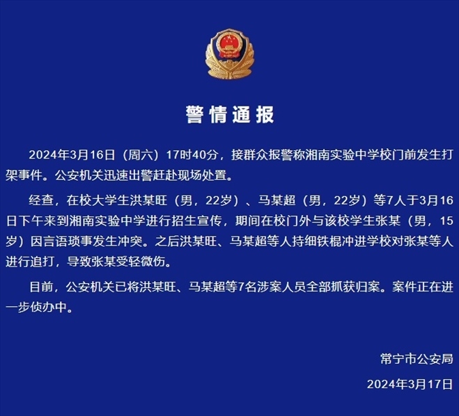 ·多人持棍沖進(jìn)學(xué)校追打中學(xué)生,湖南常寧警方通報(bào):7名涉案人員已全部抓獲歸案。