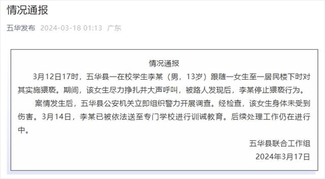 ·13歲在校男生跟隨女生實(shí)施猥褻?廣東梅州五華縣通報(bào)。