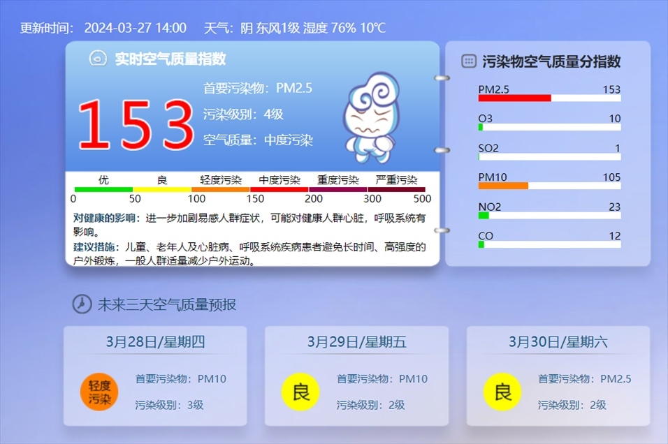 央視網(wǎng)消息:據(jù)@北京環(huán)境監(jiān)測 消息,3月27日14時(shí),北京實(shí)時(shí)空氣質(zhì)量為中度污染,首要污染物為PM2.5,污染級別4級。