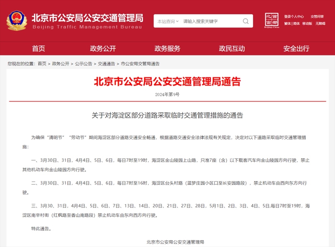 央視網(wǎng)消息:據(jù)北京市公安局公安交通管理局消息,3月26日,北京市交管局網(wǎng)站發(fā)布《關于對海淀區(qū)部分道路采取臨時交通管理措施的通告》,為確?!扒迕鞴?jié)”“勞動節(jié)”期間海淀區(qū)部分道路交通安全暢通,根據(jù)道路交通安全法律法規(guī)有關規(guī)定,決定對以下道路采取臨時交通管理措施。