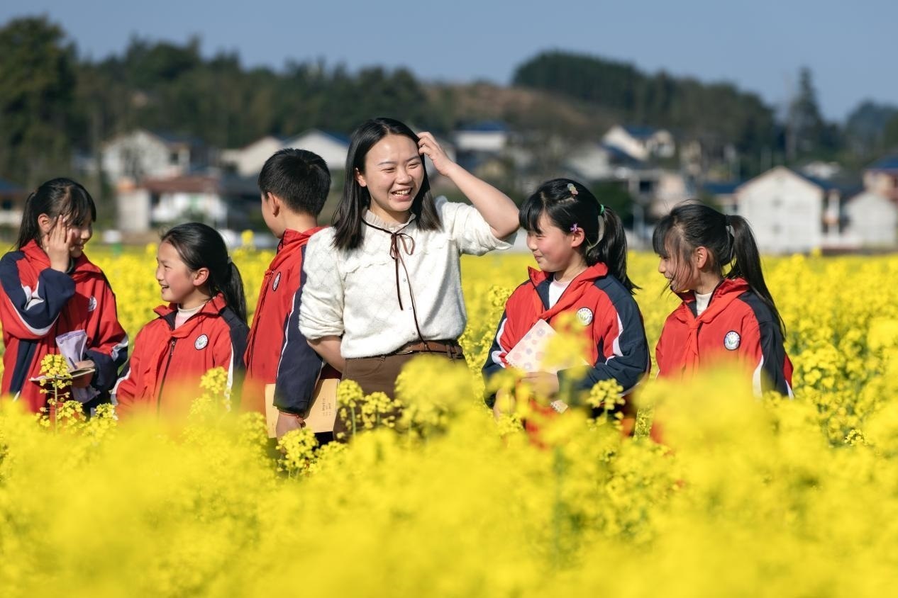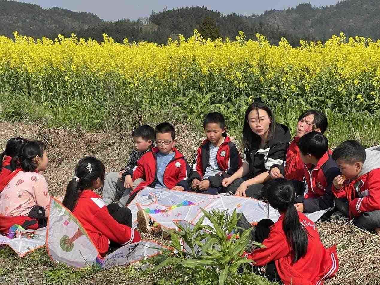 李柏霖不愿意讓孩子們覺得這樣的情緒是生活的全部。她把課堂搬到野外,在“搖搖花”開的時候帶孩子們?nèi)タ础皳u搖花”,油菜花開時去看油菜花。花也是詩,家鄉(xiāng)也是詩——若非如此,老師為什么走了又回呢?