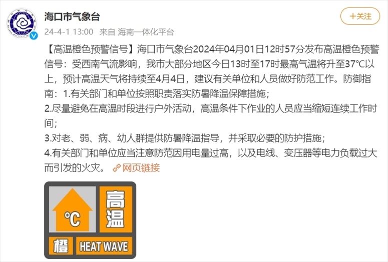 央視網(wǎng)消息:據(jù)@??谑袣庀笈_ 微博消息,??谑袣庀笈_2024年04月01日12時57分發(fā)布高溫橙色預警信號:受西南氣流影響,??谑写蟛糠值貐^(qū)今日13時至17時最高氣溫將升至37℃以上,預計高溫天氣將持續(xù)至4月4日,建議有關(guān)單位和人員做好防范工作。