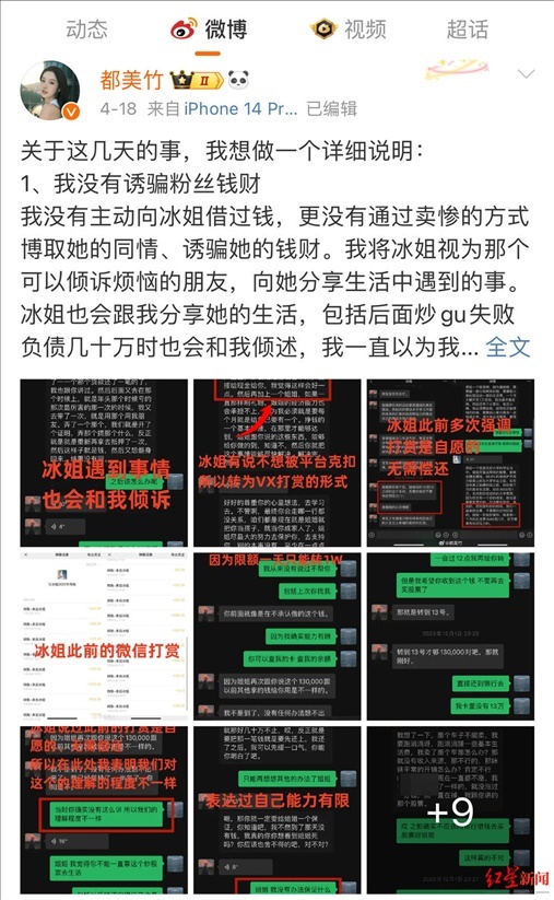 微博上,都美竹把上述朱姐說過的“無需你償還”“心甘情愿”、愿意供都美竹上大學的聊天截圖放在一起,表示朱姐“此前多次強調,打賞是自愿的,無需償還”。