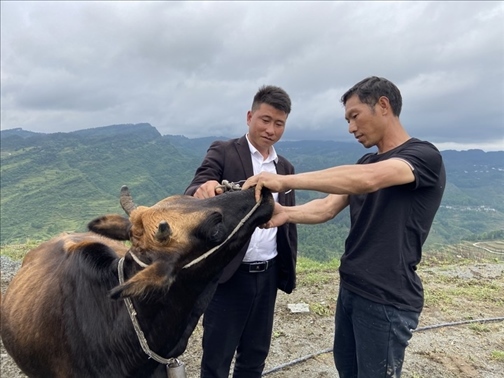 楊勝?gòu)?qiáng)(左)同養(yǎng)殖戶(hù)一起查看牛的年齡(2022年10月13日攝)。新華社發(fā)(張倩秋 攝)