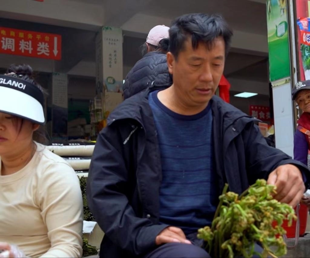 王后國(guó)在查看收購(gòu)蕨菜的品質(zhì)。新華社發(fā) 阮斌 攝于2024年3月29日