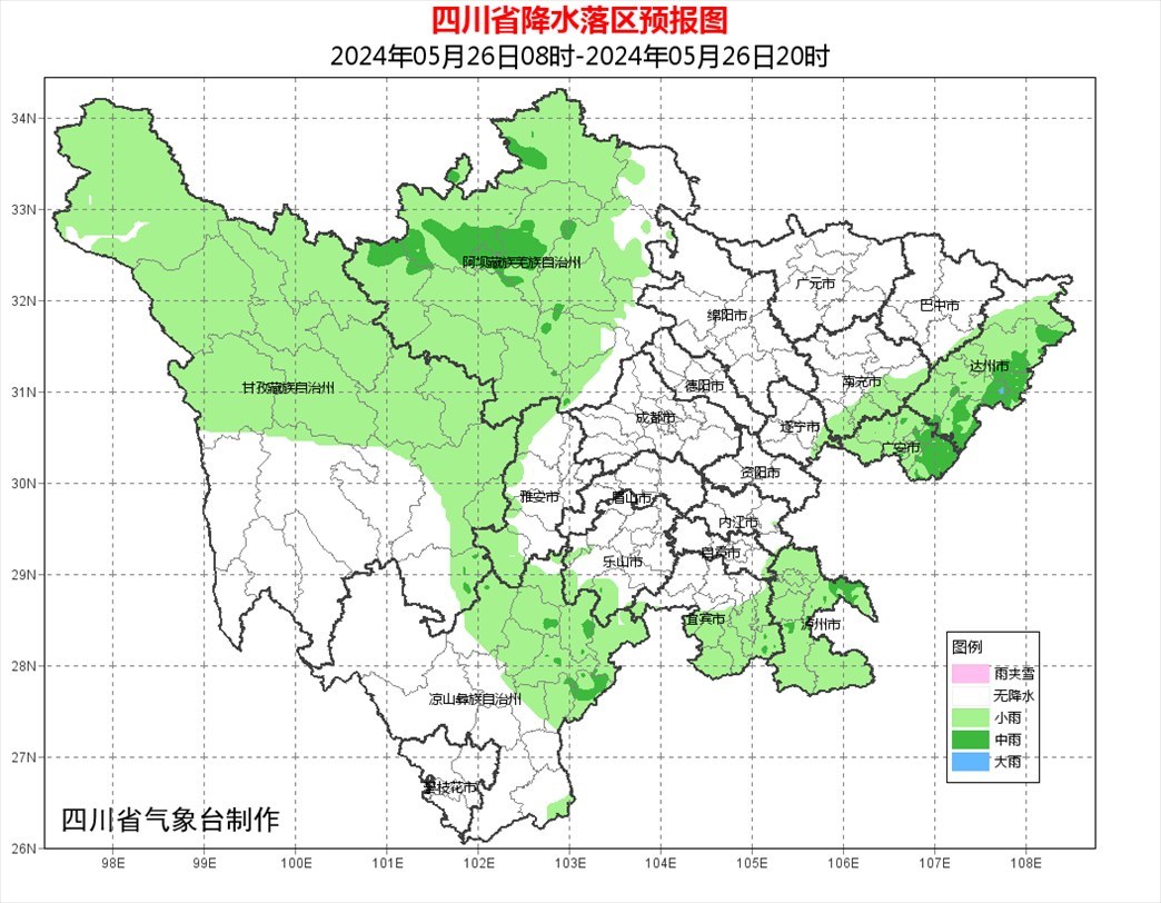 今天晚上:廣元、綿陽(yáng)、德陽(yáng)、成都4市多云間晴,盆地其余地方陣雨或雷雨轉(zhuǎn)多云,雨量普遍小到中雨,其中宜賓、瀘州、雅安、樂(lè)山、廣安、達(dá)州6市部分地方有大雨到暴雨,個(gè)別大暴雨;甘孜州和涼山州大部多云間陰有分散陣雨或雷雨,其中涼山州東北部有大雨到暴雨;阿壩州和攀枝花市多云間晴。