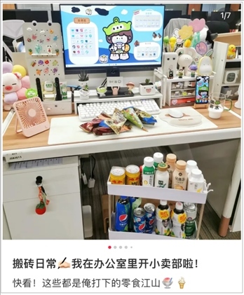 除此之外,還有人在工位養(yǎng)魚(yú)、寄居蟹、水母、蟑螂等寵物;有人在工位開(kāi)起了“小賣部”,吃的喝的樣樣俱全;有人環(huán)繞工位放上了靠墊、坐墊、抱枕、毛毯、沙發(fā)椅,保證隨時(shí)可以躺、靠、臥,主打一個(gè)舒適。