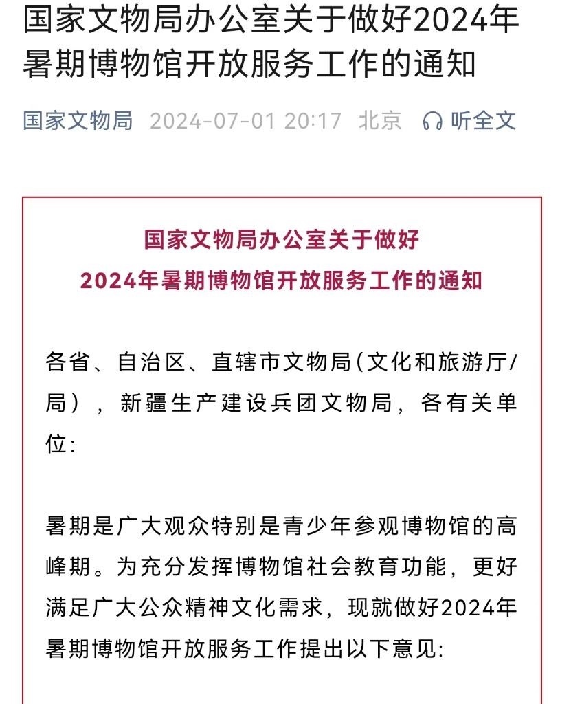 國家文物局7月1日發(fā)出通知,就做好2024年暑期博物館開放服務工作進行部署。通知明確,各級文物行政主管部門要加強指導,科學評估場館承載量,創(chuàng)新舉措,通過多種方式提高觀眾參觀博物館便利化水平。