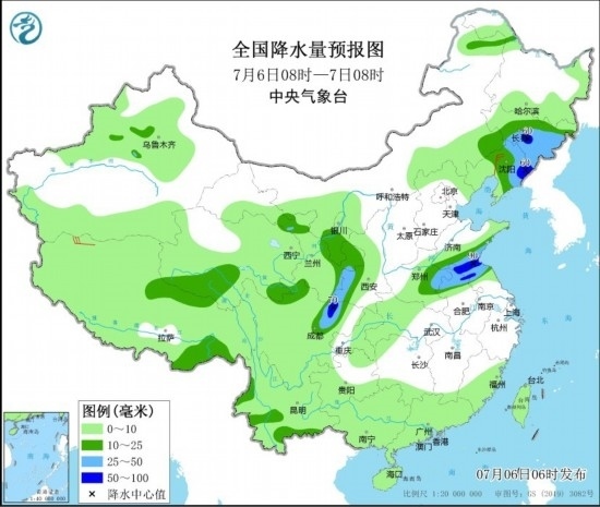 7月6日08時(shí)至7日08時(shí),內(nèi)蒙古東南部、東北地區(qū)中東部和西部、西藏北部和東南部、青海南部、西北地區(qū)東北部、黃淮東部和西部、江淮東部和西部、四川盆地西北部、云南西南部等地部分地區(qū)有中到大雨,其中,吉林中東部、遼寧東部、山東南部、江蘇北部、四川盆地西北部等地部分地區(qū)有暴雨(50~90毫米)。遼寧中部、西藏西部等地部分地區(qū)有4~6級(jí)風(fēng)。