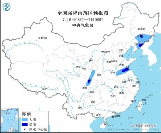預(yù)計(jì),7月6日08時(shí)至7日08時(shí),吉林中東部、遼寧東部、陜西南部、山東南部、河南東部、安徽北部、江蘇北部、四川盆地西北部等地部分地區(qū)有大雨,其中,吉林中東部、遼寧東部、山東南部、江蘇北部、四川盆地西北部等地部分地區(qū)有暴雨(50~90毫米)。上述部分地區(qū)伴有短時(shí)強(qiáng)降水(最大小時(shí)降雨量20~50毫米,局地可超過60毫米);吉林東部、遼寧東部、山東南部、河南東部、安徽北部、江蘇北部等地的部分地區(qū)將有8-10級(jí)雷暴大風(fēng)或冰雹天氣。中央氣象臺(tái)7月6日06時(shí)發(fā)布暴雨藍(lán)色預(yù)警和強(qiáng)對(duì)流天氣藍(lán)色預(yù)警。