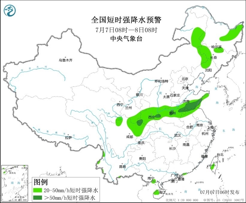 預(yù)計7月7日08時至8日08時,內(nèi)蒙古東北部、黑龍江東北部和西南部、吉林北部、青海東南部、甘肅東南部、陜西南部、山西西南部、山東南部、河南中部、安徽北部、江蘇北部、四川北部、重慶西部等地的部分地區(qū)將有8級以上雷暴大風(fēng)或冰雹天氣,其中,山東南部、河南東部、安徽北部、江蘇北部等地的部分地區(qū)將有10級以上雷暴大風(fēng),最大風(fēng)力可達(dá)11級以上;內(nèi)蒙古東部、黑龍江中東部、吉林中西部、遼寧北部、甘肅東南部、陜西中南部、山西南部、山東中南部、河南中北部、安徽北部、江蘇北部、四川北部、海南島西北部、臺灣島西南部等地的部分地區(qū)將有小時雨量大于20毫米的短時強(qiáng)降水天氣,其中,陜西東南部、山東南部、河南中部、江蘇北部、四川盆地西北部等地的部分地區(qū)將有小時雨量大于50毫米,最大可達(dá)70毫米以上。