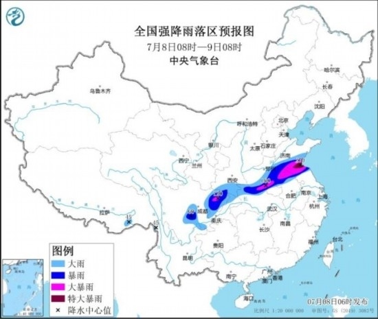中央氣象臺(tái)7月8日06時(shí)繼續(xù)發(fā)布暴雨橙色預(yù)警和強(qiáng)對(duì)流天氣藍(lán)色預(yù)警。預(yù)計(jì),7月8日08時(shí)至9日08時(shí),陜西南部、黃淮大部、江漢北部、四川盆地等地的部分地區(qū)有大到暴雨,其中,山東南部、河南東部和南部、蘇皖北部、四川盆地東北部等地的部分地區(qū)有大暴雨,山東南部、江蘇北部等地局地特大暴雨(250~270毫米)。上述部分地區(qū)伴有短時(shí)強(qiáng)降水(最大小時(shí)降雨量30~50毫米,局地可超過80毫米)。內(nèi)蒙古東南部、吉林南部和東部、遼寧東部和北部、山東南部、河南東部和西南部、安徽北部、江蘇北部和東部、四川東北部等地的部分地區(qū)將有8級(jí)以上雷暴大風(fēng)或冰雹天氣,其中,河南東部、安徽北部、江蘇北部和東部等地的部分地區(qū)將有10級(jí)以上雷暴大風(fēng),最大風(fēng)力可達(dá)11級(jí)以上。