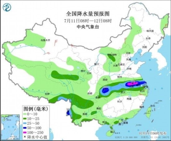 全國降水量預(yù)報(bào)圖(7月11日08時(shí)-12日08時(shí))