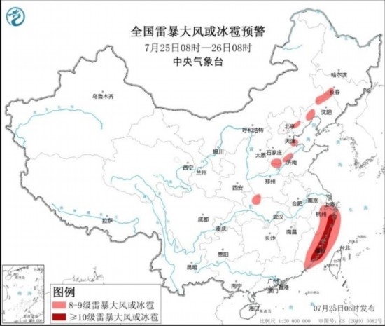 中央氣象臺(tái)7月25日06時(shí)繼續(xù)發(fā)布暴雨橙色預(yù)警和強(qiáng)對(duì)流天氣黃色預(yù)警。預(yù)計(jì),7月25日08時(shí)至26日08時(shí),內(nèi)蒙古東部、吉林、遼寧、天津、河北東部、河南北部、山東北部、浙江南部、福建、廣東東部、臺(tái)灣島等地部分地區(qū)有大到暴雨,其中,內(nèi)蒙古東南部、遼寧中西部、河北東北部、山東北部、浙江南部、福建東部、廣東東南部、臺(tái)灣島大部等地部分地區(qū)有大暴雨,福建東北部、臺(tái)灣島中南部等地局地特大暴雨(250~500毫米),上述部分地區(qū)伴有短時(shí)強(qiáng)降水(最大小時(shí)降雨量30~50毫米,局地可超過80毫米)。內(nèi)蒙古東南部、遼寧北部和西部、河北南部和東北部、天津北部、山東北部、河南北部、浙江、福建等地的部分地區(qū)將有8級(jí)以上雷暴大風(fēng)或冰雹天氣,其中,浙江中南部、福建東部等地的部分地區(qū)將有10級(jí)以上雷暴大風(fēng),最大風(fēng)力可達(dá)12級(jí)以上。