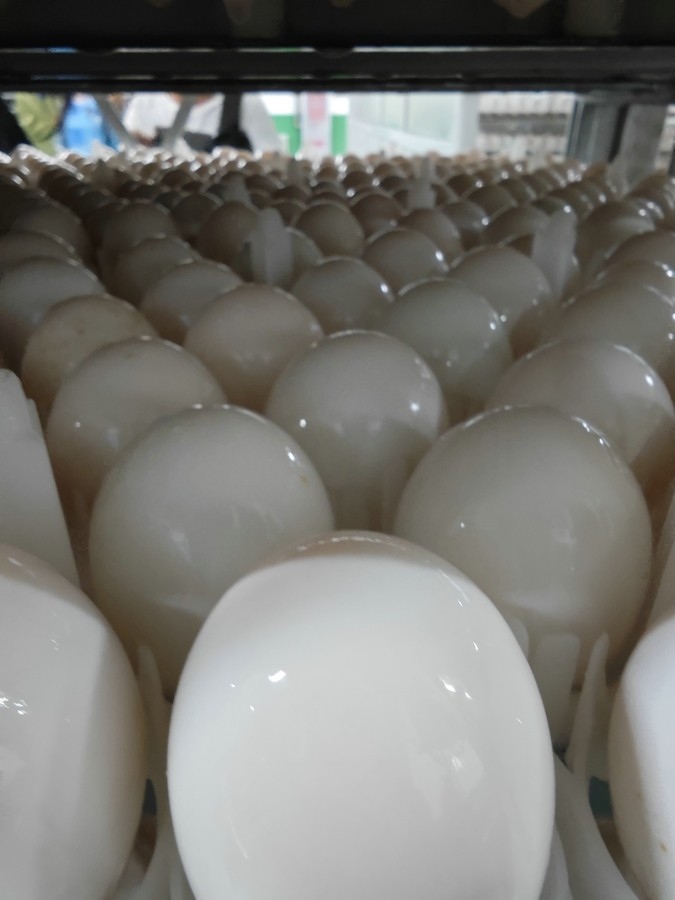 選蛋、稱重、儲(chǔ)蛋、洗蛋、孵化、落盤、出雛、出苗……經(jīng)過(guò)一系列程序,并經(jīng)過(guò)25天的孵化后,種蛋由孵化車轉(zhuǎn)移到出雛筐,在此等待3天,就完成了由蛋到苗的蛻變。