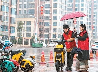 江西贛州興國(guó)縣長(zhǎng)征社區(qū)志愿者在街頭整理共享單車。陳 鵬攝(人民視覺)