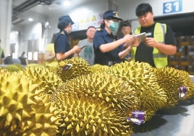 日前,在廣西憑祥市友誼關(guān)口岸海關(guān)查驗平臺,工作人員查驗一批進口榴蓮。新華社記者 陸波岸攝