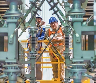 國(guó)網(wǎng)南京供電公司員工與南瑞集團(tuán)工作人員在變電站查看設(shè)備狀態(tài)。杜 懿攝