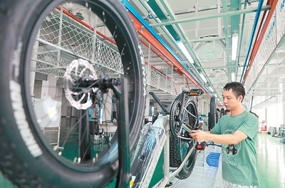 江西省九江經濟技術開發(fā)區(qū)九江馳暢車業(yè)有限公司生產車間內,工人正在組裝銷往歐美市場的新能源助力自行車。魏東升攝(人民視覺)
